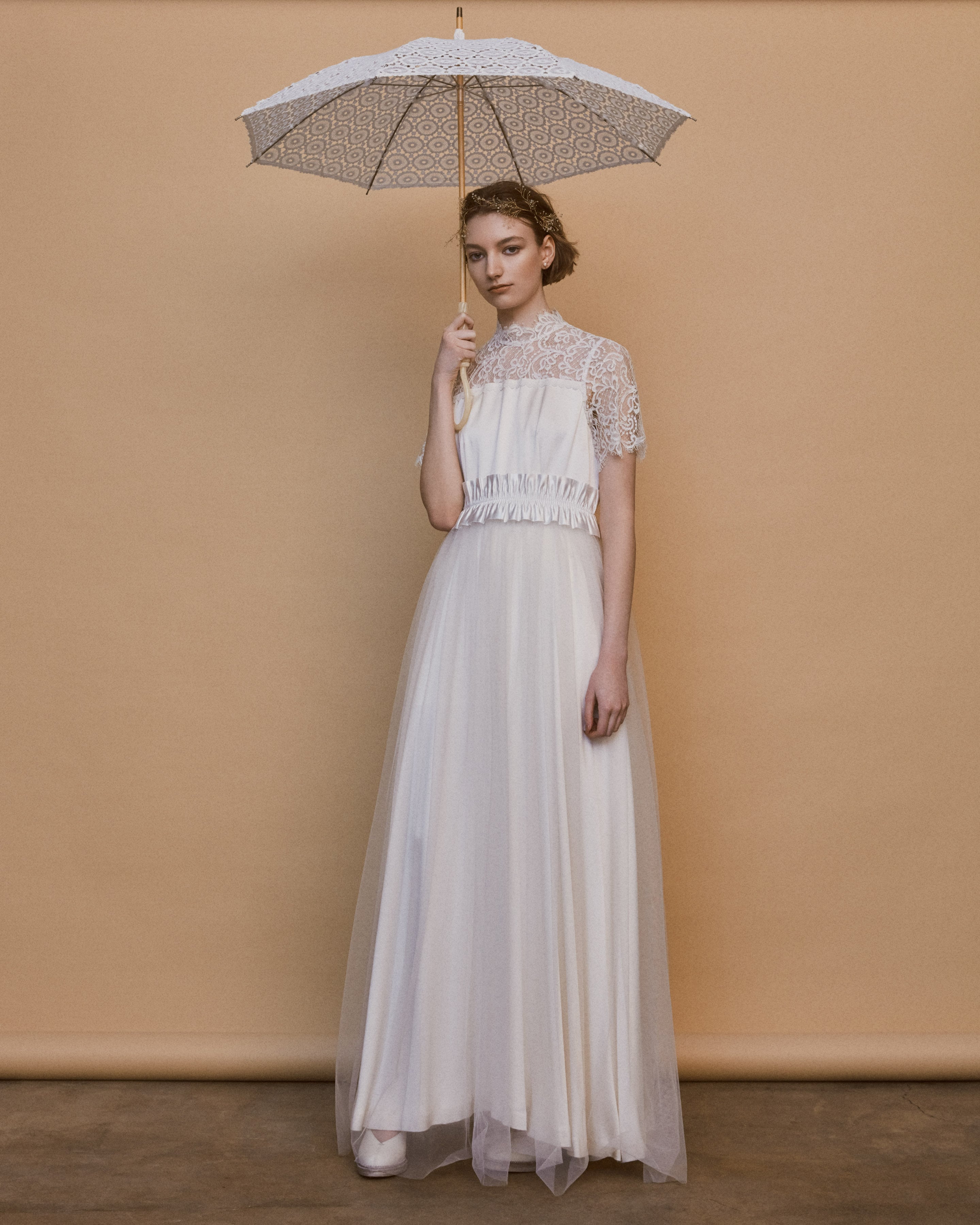 ハイネックで透明感のあるコードリバーレースをデコルテ部分に、胸元はシルクサテン、スカート部分はチュール生地で優しい雰囲気に ウエスト部分の、サテンのフリルリボンがアクセントになっています 様々なシチュエーションに合うクラシカルで可愛らしさのある人気のドレスです レストランウエディングなどオススメです