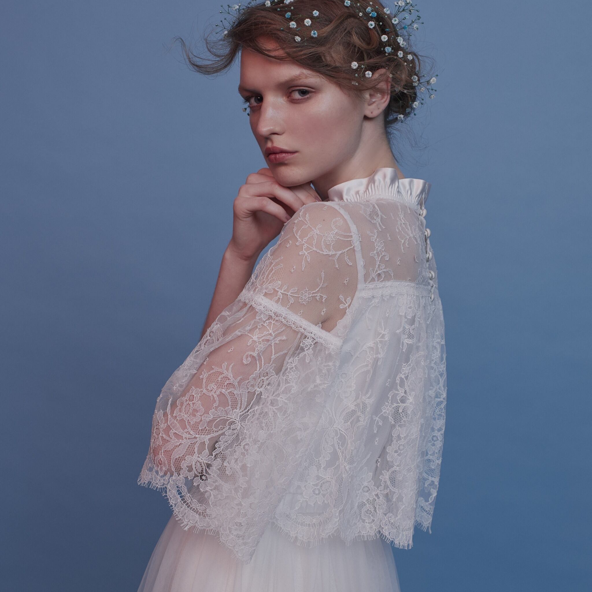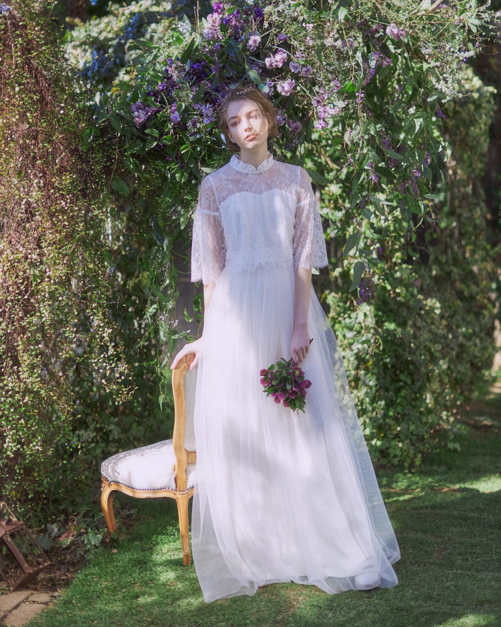 柔らかいチュールリバーレースをTOP部分に使用したウエディングドレス 袖はボリュームのあるフレアに、バックスタイルはギャザーで少しボリュームのあるシルエットになっています。 スカート部分はシルクサテンの上にボリュームのあるオーバーチュールスカートです(取り外し可能) 襟元はサテンフリルリボンで立体的に、胸元のMカットが女性らしい優しいナチュラルなドレスです ガーデンウエディングやレストランウエディング、フォトウエディングにもオススメです