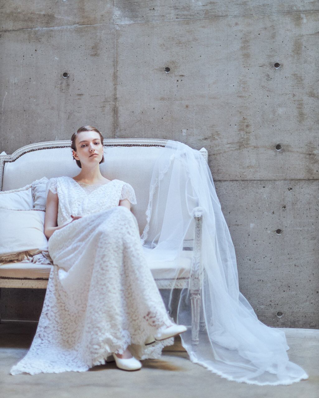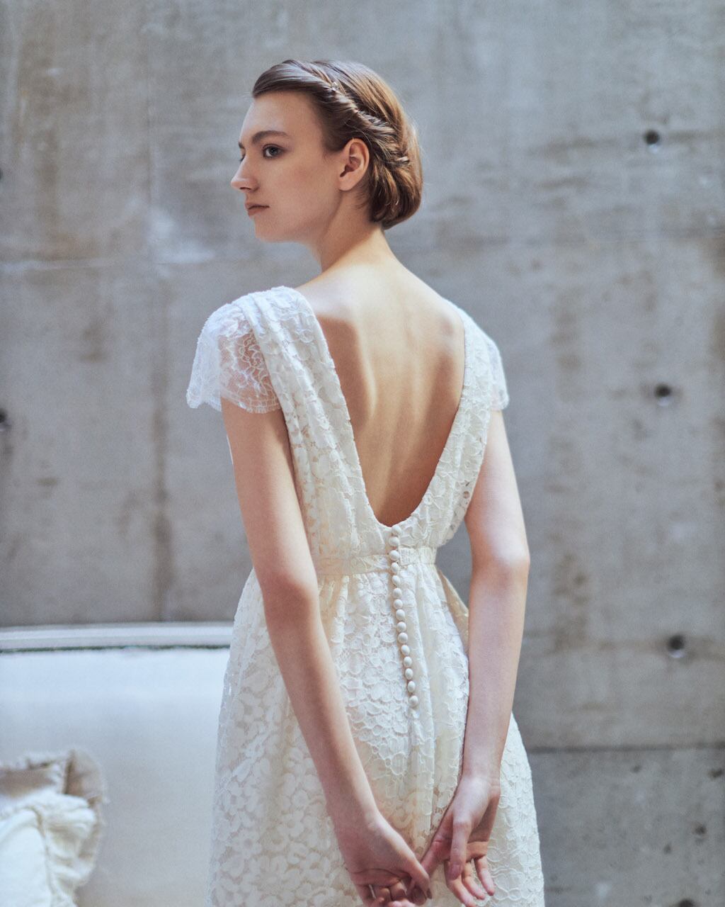 コードリバーレースを全面に胸元と袖口は華奢なチュールレースを使用しています。 バックスタイルはUカットで腰にかけて連なるくるみボタンがとてもクラシカルで可愛らしい雰囲気に。 レストランウエディングやフォトウエディングにオススメです
